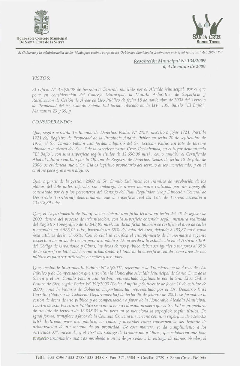 Aprueba la Minuta Aclarativa de Superficie y Ratificación de Cesión de áreas de Uso Público a favor del Gobierno Municipal de Santa Cruz de la Sierra del Terreno ubicado en la UV. 139, Mza 23 y 39 del Distrito Municipal N° 10, Zona Sur Oeste de la Ciudad, de propiedad del Sr. Camilo Fabián Eid Jordán.