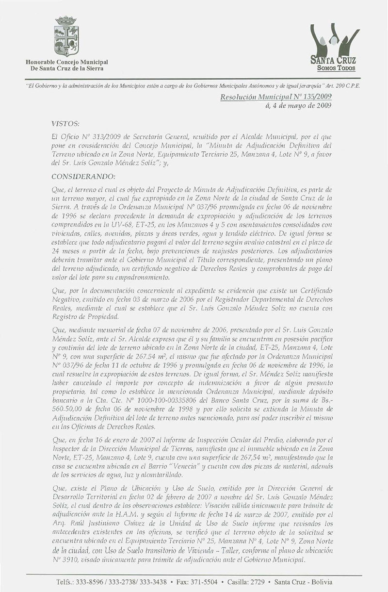 Aprueba la Minuta de Adjudicación del Terreno ubicado en la Zona Norte, Equipamiento Terciario 25, Manzana 4, Lote N° 9, a favor del Sr. Luís Gonzalo Méndez Soliz, con una superficie de 267,54 mts².