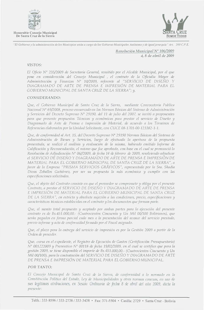 Aprueba el Contrato de la Oficialía Mayor de Administración y Finanzas N° 10/2009, referente al "Servicio de Diseño y Diagramación de Arte de Prensa e Impresión de Material para el Gobierno Municipal de Santa Cruz de la Sierra".