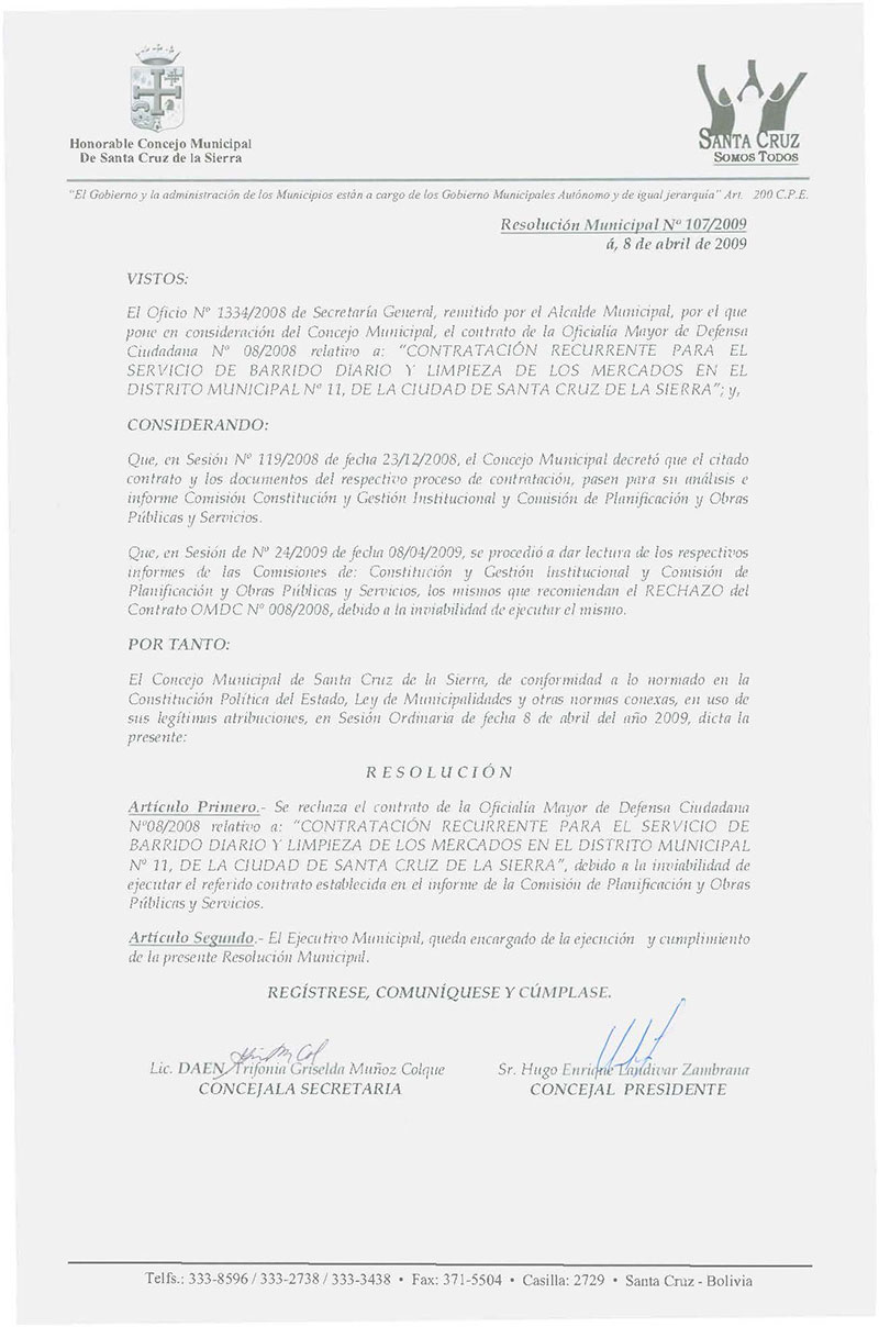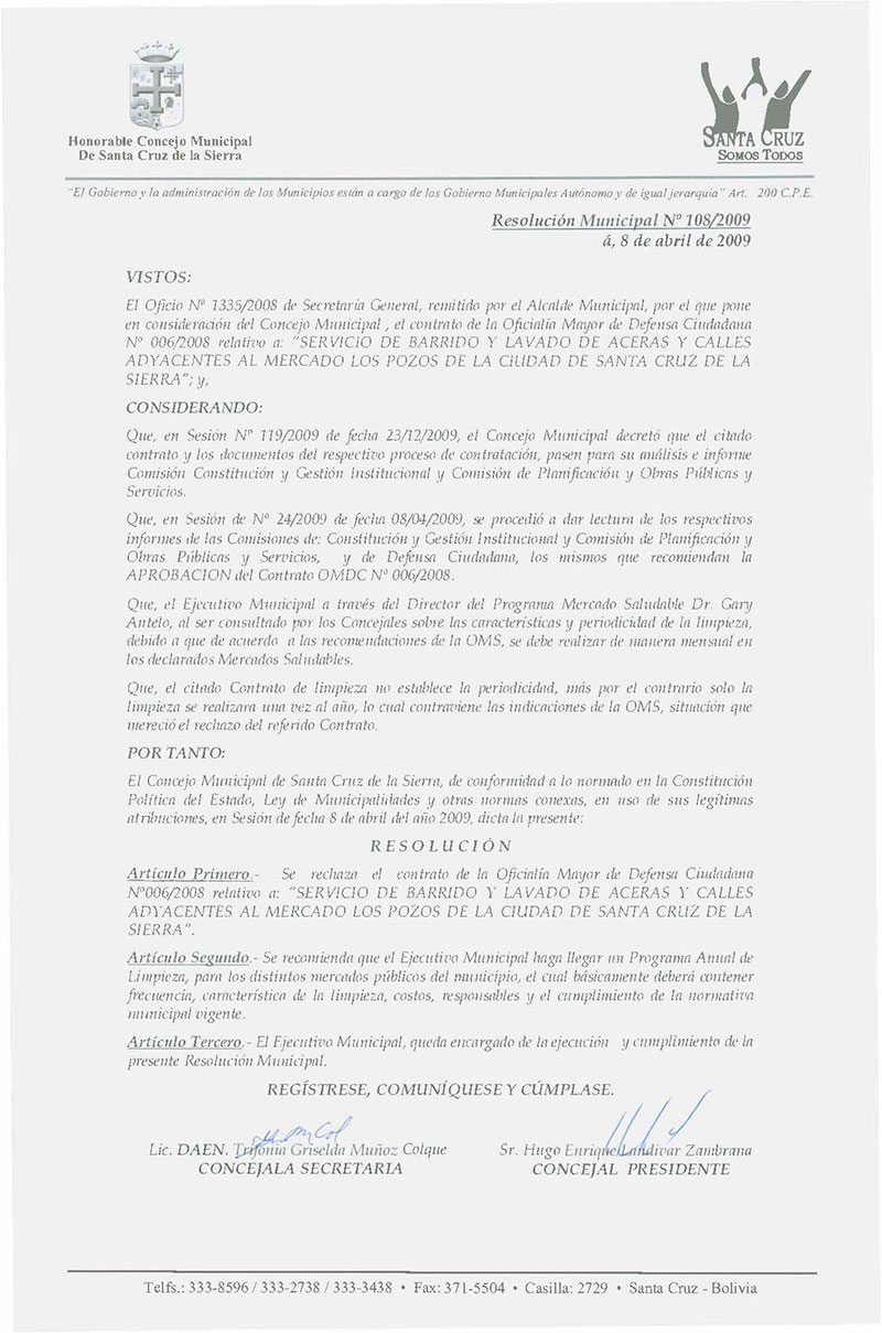 Rechaza el Contrato de la Oficialía Mayor de Defensa Ciudadana N° 006/2008, relativo al "Servicio de Barrido y Lavado de Aceras y Calles adyacentes al Mercado Los Pozos de la Ciudad de Santa Cruz de la Sierra".