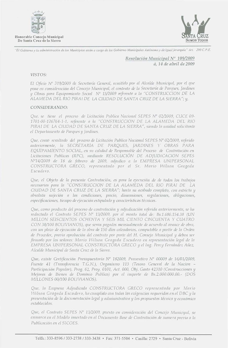 Aprueba el Contrato de la Secretaria de Parques, Jardines y Obras para Equipamiento Social N° 13/2009, por el monto total de Bs. 1,686,154,38 para la "Construcción de la Alameda del Río Piraí de la ciudad de Santa Cruz de la Sierra".