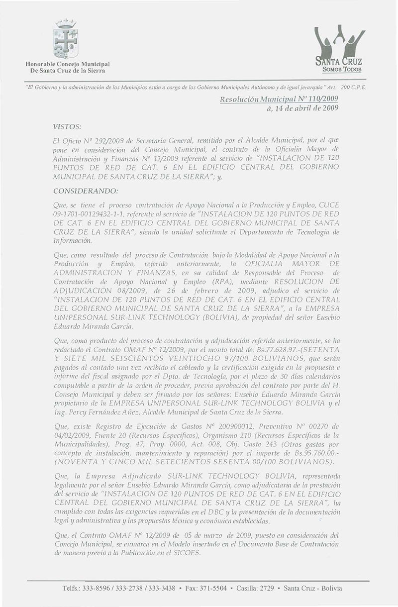 Aprueba el Contrato de la Oficialía Mayor de Administración y Finanzas N° 12/2009, por el monto total de Bs. 77,628,97.- para el Servicio de "Instalación de 120 puntos de red de CAT. 6 en el edificio Central del Gobierno Municipal de Santa Cruz de la Sierra.