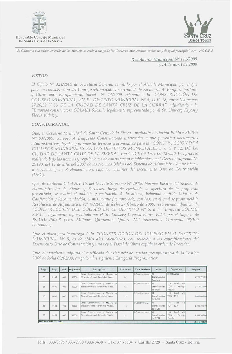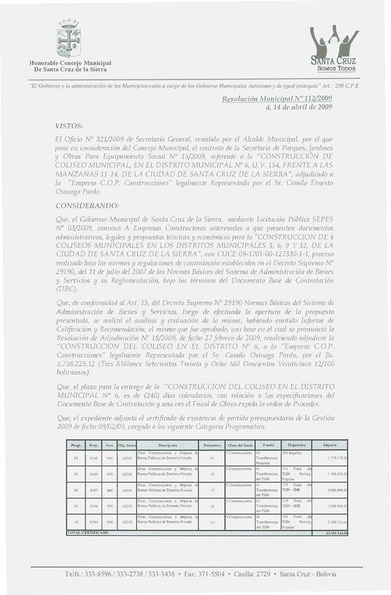 Aprobación del Contrato de la Secretaria de Parques, Jardines y Obras para Equipamiento Social N° 15/2009, referente a la "Construcción de Coliseo Municipal en el Distrito Municipal N° 6, UV. 154, frente a las Manzanas 11-14, de la ciudad de Santa Cruz de la Sierra.
