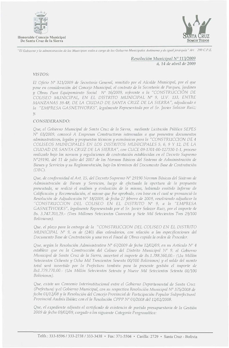 Aprueba el Contrato de la Secretaria de Parques, Jardines y Obras para Equipamiento Social N° 16/2009, referente a la "Construcción de Coliseo Municipal, en el Distrito Municipal N° 9, UV 133, entre Manzanas 39 y 48 de la ciudad de Santa Cruz de la Sierra.