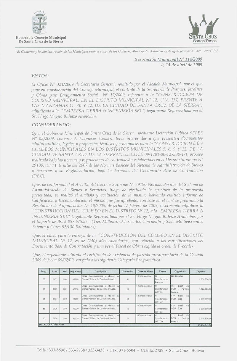 Aprueba el Contrato de la Secretaria de Parques, Jardines y Obras para Equipamiento Social N° 17/2009, referente a la "Construcción de Coliseo Municipal en el Distrito Municipal N° 12 UV. 177, frente a las Manzanas 11, 40 y 22 de la ciudad de Santa Cruz de la Sierra.