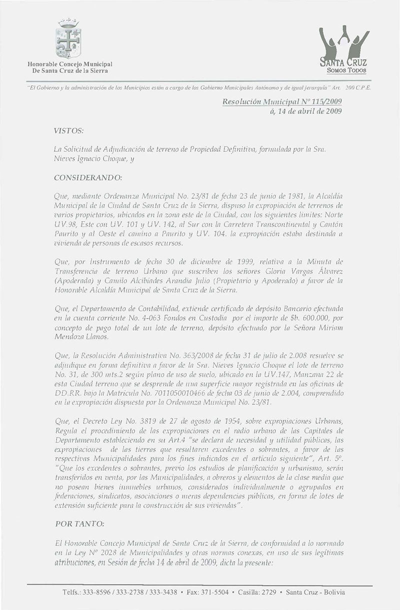 Aprueba la Minuta de Transferencia de Terreno en propiedad definitiva a favor de la Sra. Nieves Ignacio Choque, ubicado en el Plan 3000, en la UV. 147, Mza. 22, loteN°31 de esta ciudad.