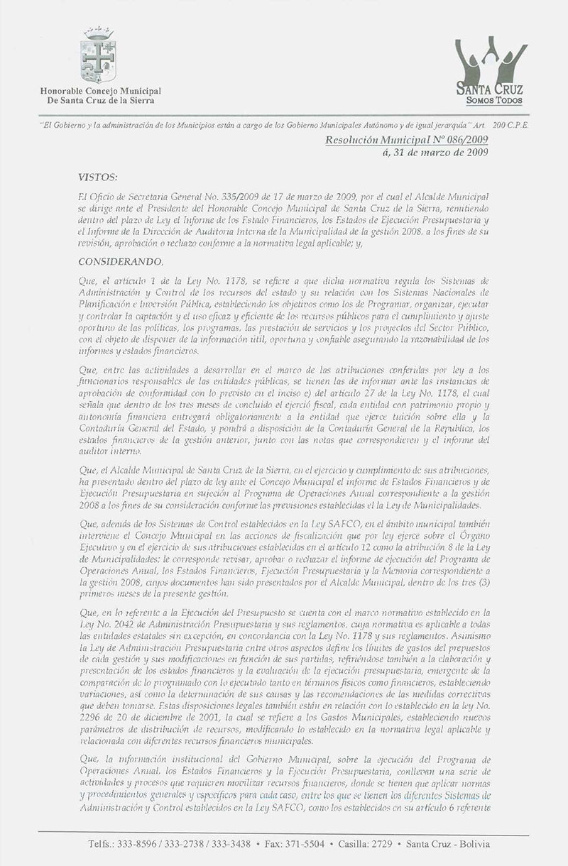 Se aprueba la Ejecución del Programa de Operación Anual, los Estados Financieros Consolidados al 31 de Diciembre del 2008, la Ejecución Presupuestaria y el Informe de la Dirección de Auditoria Interna de la Municipalidad de la gestión 2008.