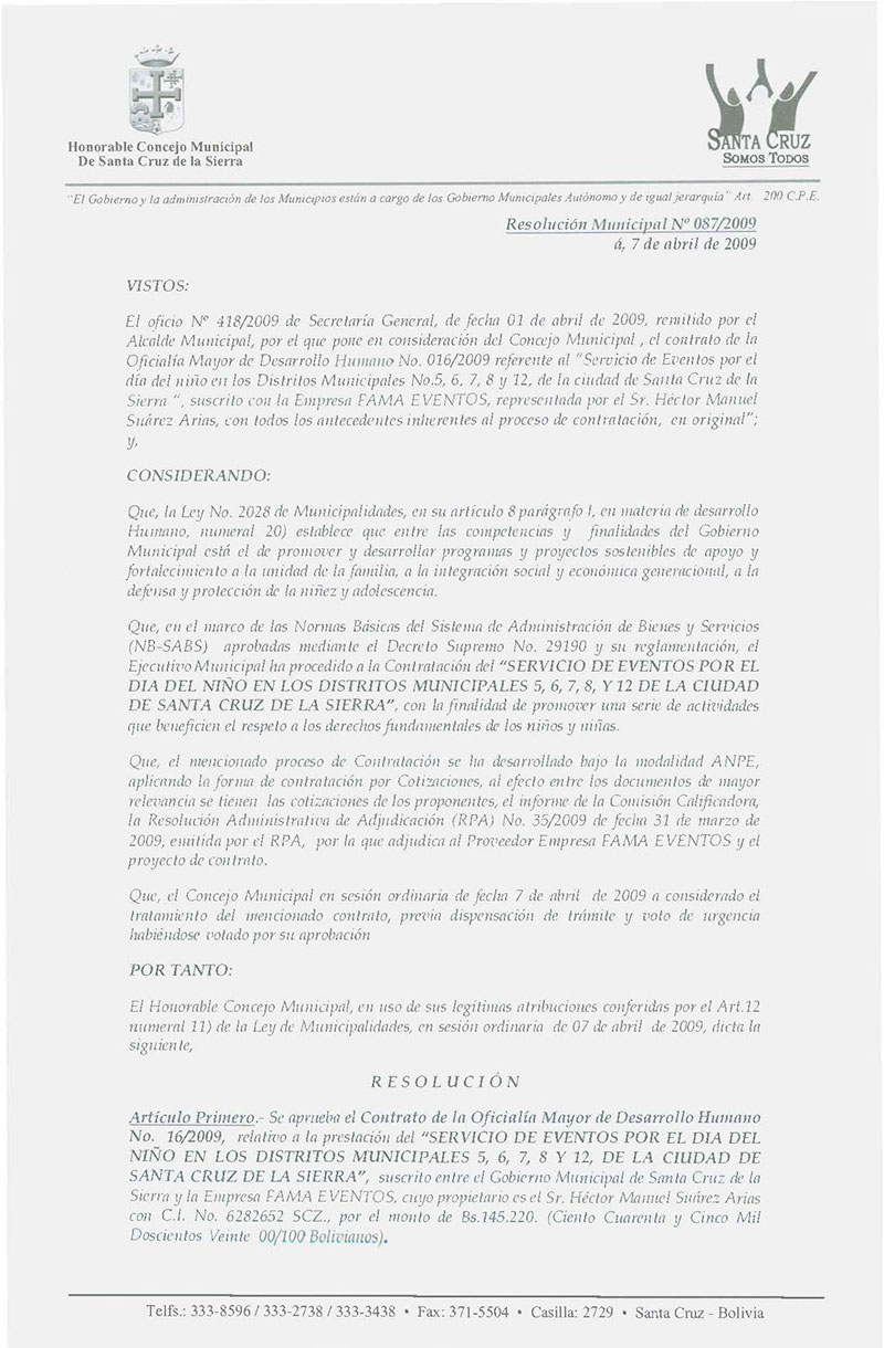 Aprueba el Contrato de la Oficialía Mayor de Desarrollo Humano N° 16/2009, relativo a la prestación del "Servicio de Eventos por el Día del Niño en los Distritos Municipales 5,6,7,8 y 12 de la Ciudad de Santa Cruz de la Sierra".