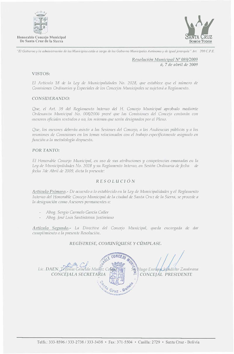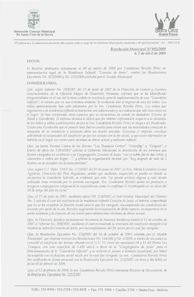 Se confirma en todas sus partes las Resoluciones Ejecutivas 037/2009, del 02 de marzo de 2009, y en su mérito la Resolución Ejecutiva N° 223/2007, del 16 de octubre de 2007, dictadas por el Alcalde Municipal, Ing. Percy Fernández Añez., asimismo abroga la Resolución Municipal N° 159/88 y la Resolución Municipal N°141/86.