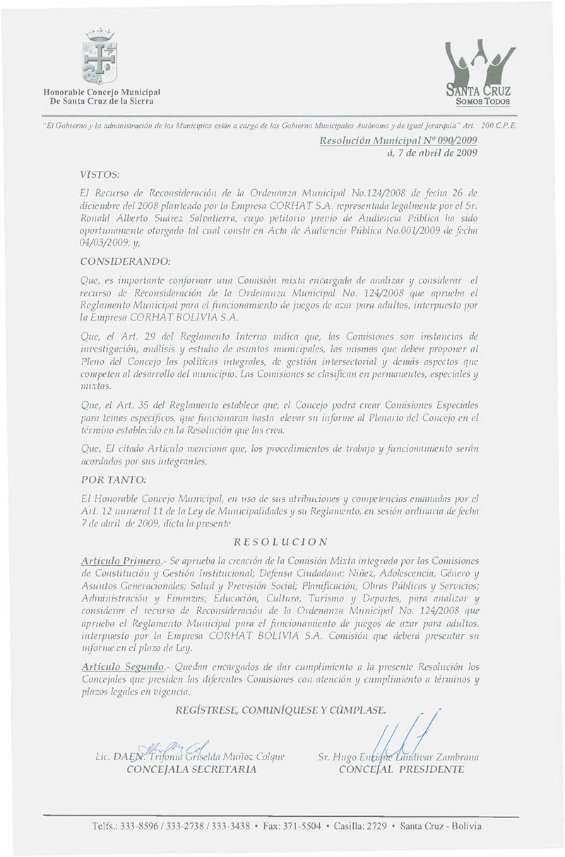 Aprueba la Creación de la Comisión Mixta integrada por las diferentes Comisiones del Concejo, para analizar y considerar el Recurso de Reconsideración de la Ordenanza Municipal No. 124/2008 que aprueba el Reglamento Municipal para el Funcionamiento de Juegos de Azar para Adultos, interpuesto por la Empresa CORHAT Bolivia S.A.