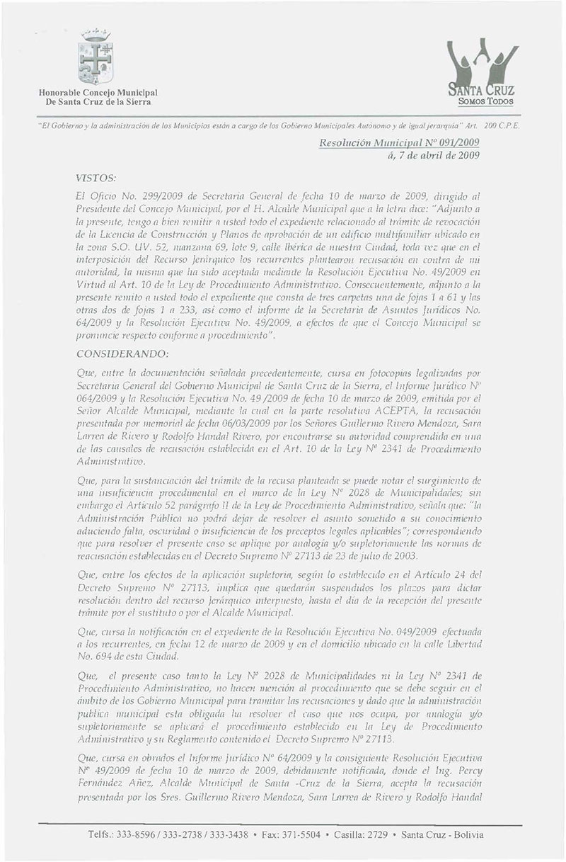 Declara procedente la Recusación presentada por los Sres. Guillermo Rivero Mendoza, Sara Larrea de Rivero y Rodolfo Handal Rivero, la misma que ha sido aceptada por la autoridad recurrida el Ing. Percy Fernández Añez Alcalde de la ciudad de Santa Cruz de la Sierra.