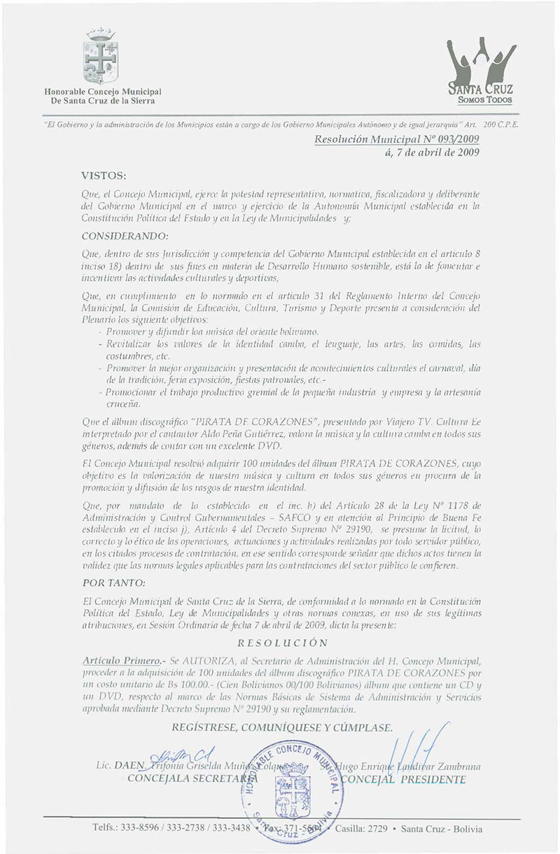 Autoriza al Secretario de Administración del H. Concejo Municipal, proceder a la adquisición de 100 unidades del álbum discográfico "Pirata de Corazones" por un costo unitario de Bs. 100,00.- álbum que contiene un CD y un DVD, respecto al marco de las normas básicas de Sistema de Administración y Servicios aprobada mediante Decreto Supremo N° 29190 y su reglamentación.