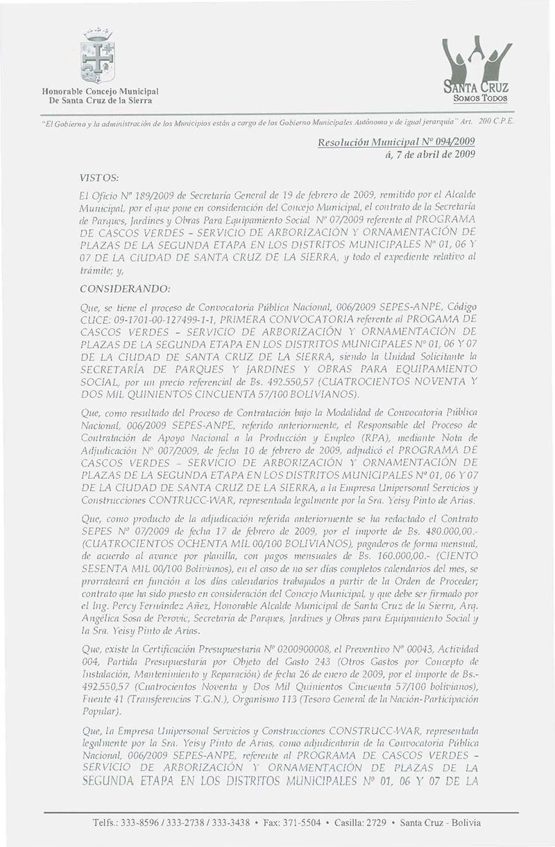 Aprueba el Contrato de la Secretaria de Parques, Jardines y Obras para el Equipamiento Social N° 07/2009, de Bs. 480,000,00.- referente al Programa de Cascos Verdes-Servicio de Arborización y Ornamentación de Plazas de la Segunda Etapa en los Distritos N° 01, 06 y 07 de la ciudad de Santa Cruz de la Sierra.