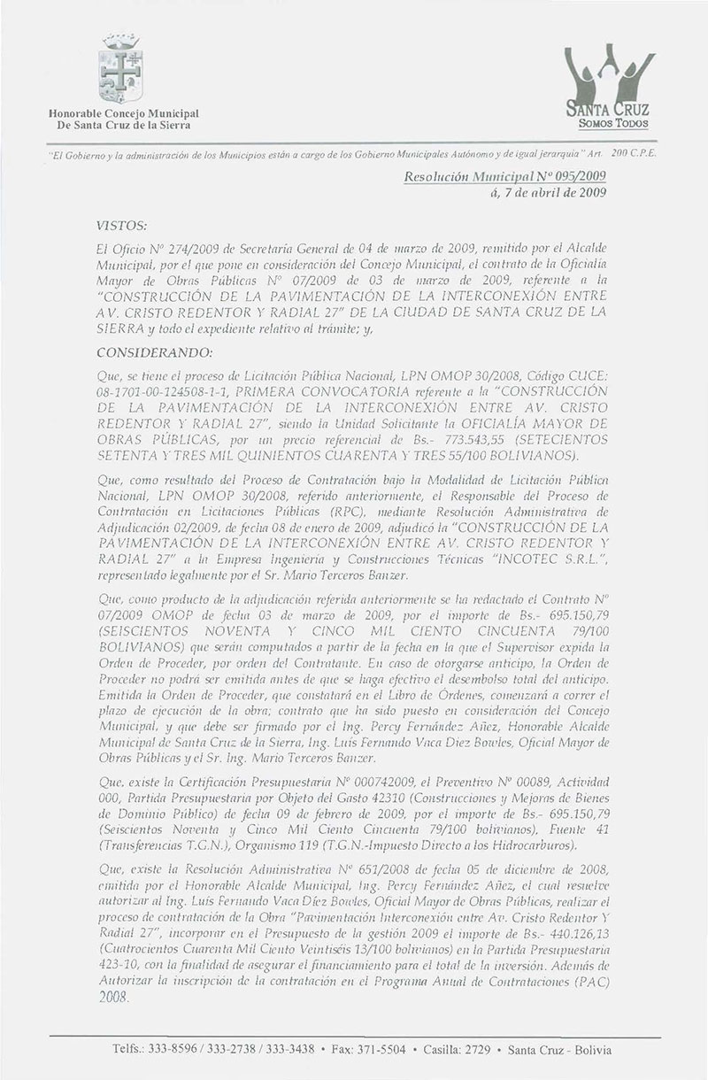 Aprueba el Contrato de la Oficialía Mayor de Obras Públicas N° 07/2009, de fecha 03 de marzo del 2009, por el monto de Bs.- 695,150,79, referente a la "Construcción de la Pavimentación de la Interconexión entre Av. Cristo Redentor y Radial 27" de la ciudad de Santa Cruz de la Sierra, adjudicado a la Empresa Ingeniería y Construcción Técnica "INCOTEC S.R.L.".