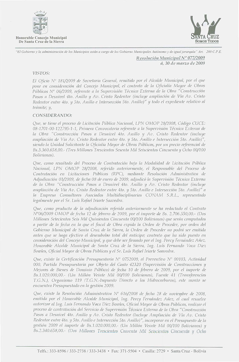 Aprueba el Contrato de Oficialía Mayor de Obras Públicas N° 06/2009, por el importe de Bs. 2,706,550,00.- referente a la Supervisión Técnica Externa de la Obra "Construcción Pasos a Desnivel 4to. Anillo y Av. Cristo Redentor" adjudicado a la Empresa a la Empresa Consultores Asociados Multidisciplinarios CONAM S.R.L.