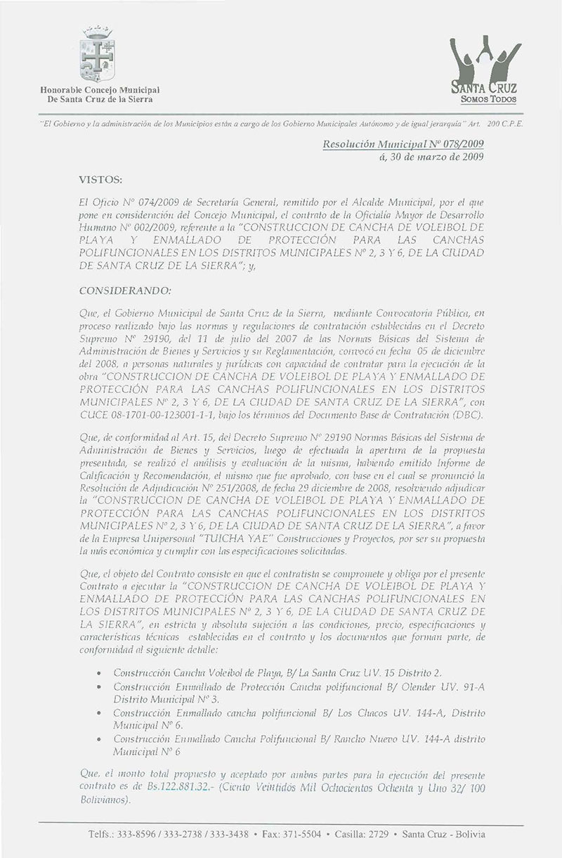 Aprueba el Contrato de Oficialía Mayor de Desarrollo Humano Nº 002/2009, referente a la "Construcción de Cancha de Voleibol de Playa y enmallado de protección para las Canchas Polifuncionales en los Distritos Municipales N° 2,3 y 6, de la ciudad de Santa Cruz de la Sierra, adjudicado a la Empresa Unipersonal "TUICHA YAE".