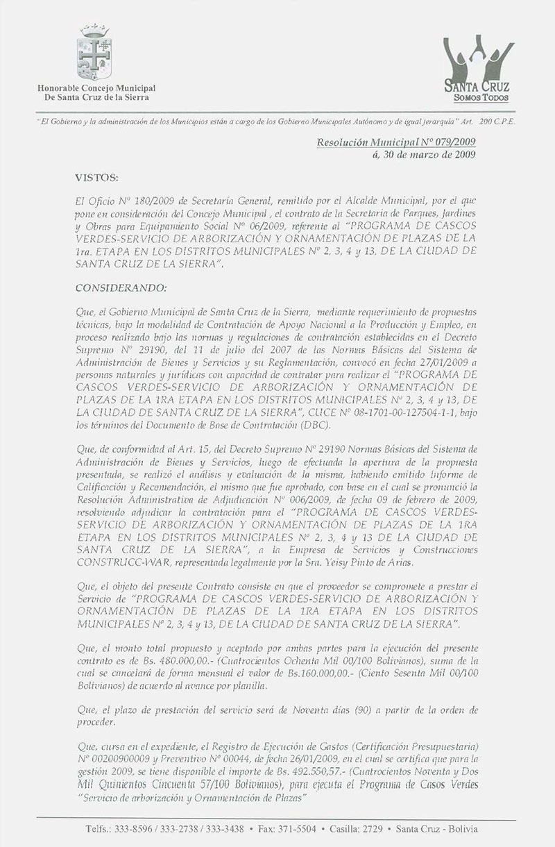 Aprueba el Contrato de la Secretaria de Parques, Jardines y Obras para Equipamiento Social N° 06/2009, referente al Programa de Cascos Verdes Servicio de Arborización y Ornamentación de Plazas de la 1ra. Etapa en los Distritos Municipales N° 2,3,4, y 13 de la ciudad de Santa Cruz de la Sierra.