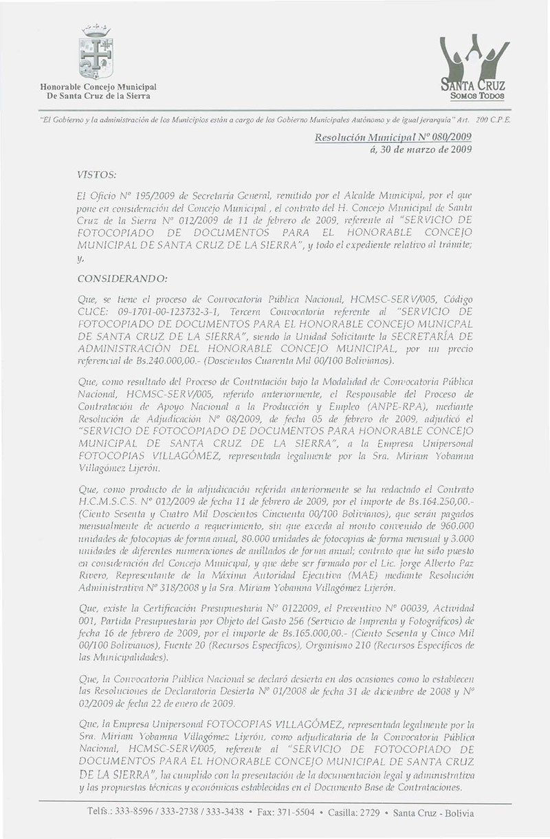 Aprueba el Contrato de la Secretaría de Administración del Concejo Municipal Nº 012/2009, referente al Servicio de Fotocopiado de Documentos para el honorable Concejo Municipal de Santa Cruz de la Sierra.