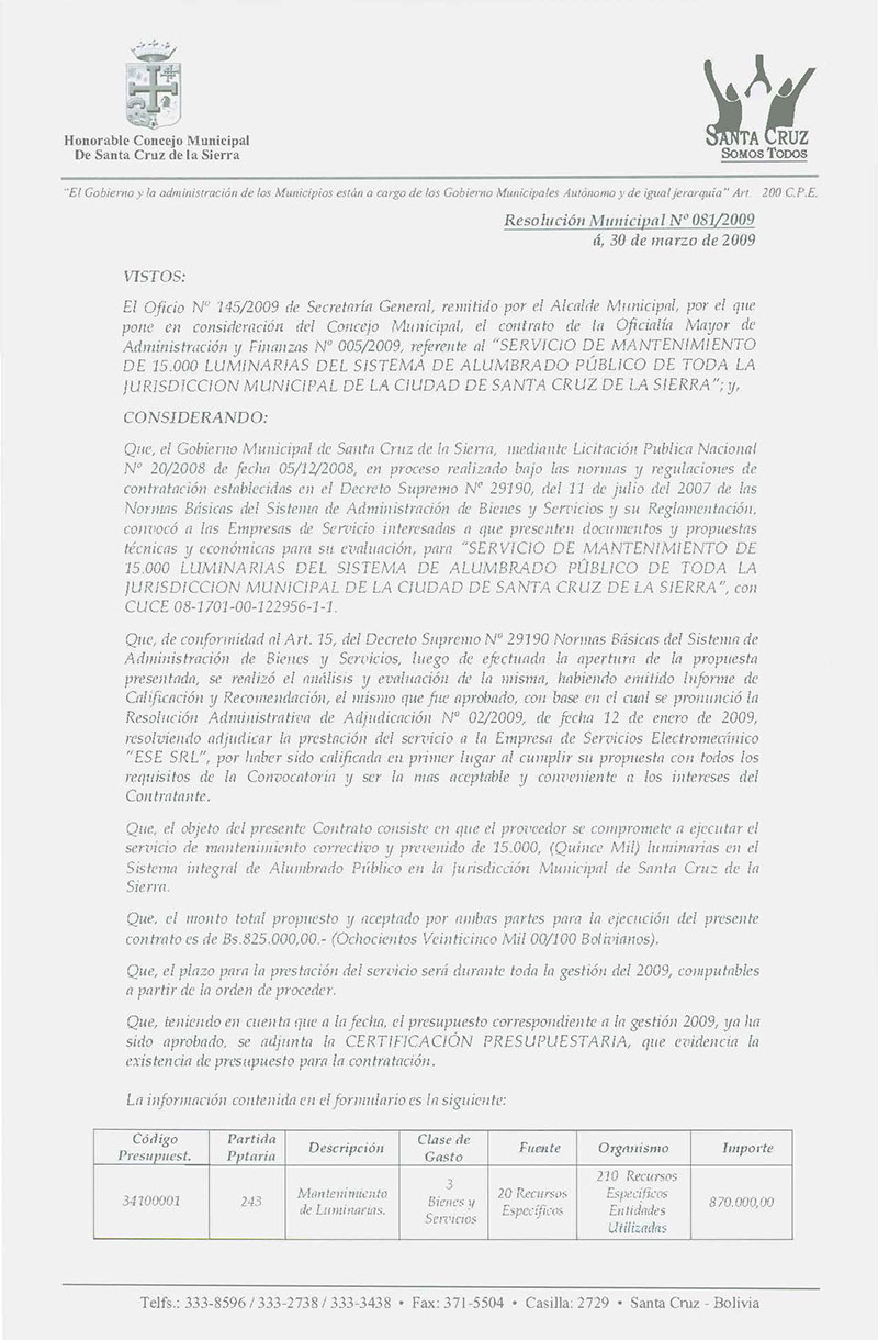 Dispone la aprobación del Contrato de la Oficialía Mayor de Administración y Finanzas N° 005/2009, referente al "Servicio de Mantenimiento de 15.000 Luminarias del Sistema de Alumbrado Público de toda la Jurisdicción Municipal de Santa Cruz de la Sierra, adjudicado a la Empresa de Servicios Electromecánicos "ESE SRL", por el monto de Bs. 825.000.00.
