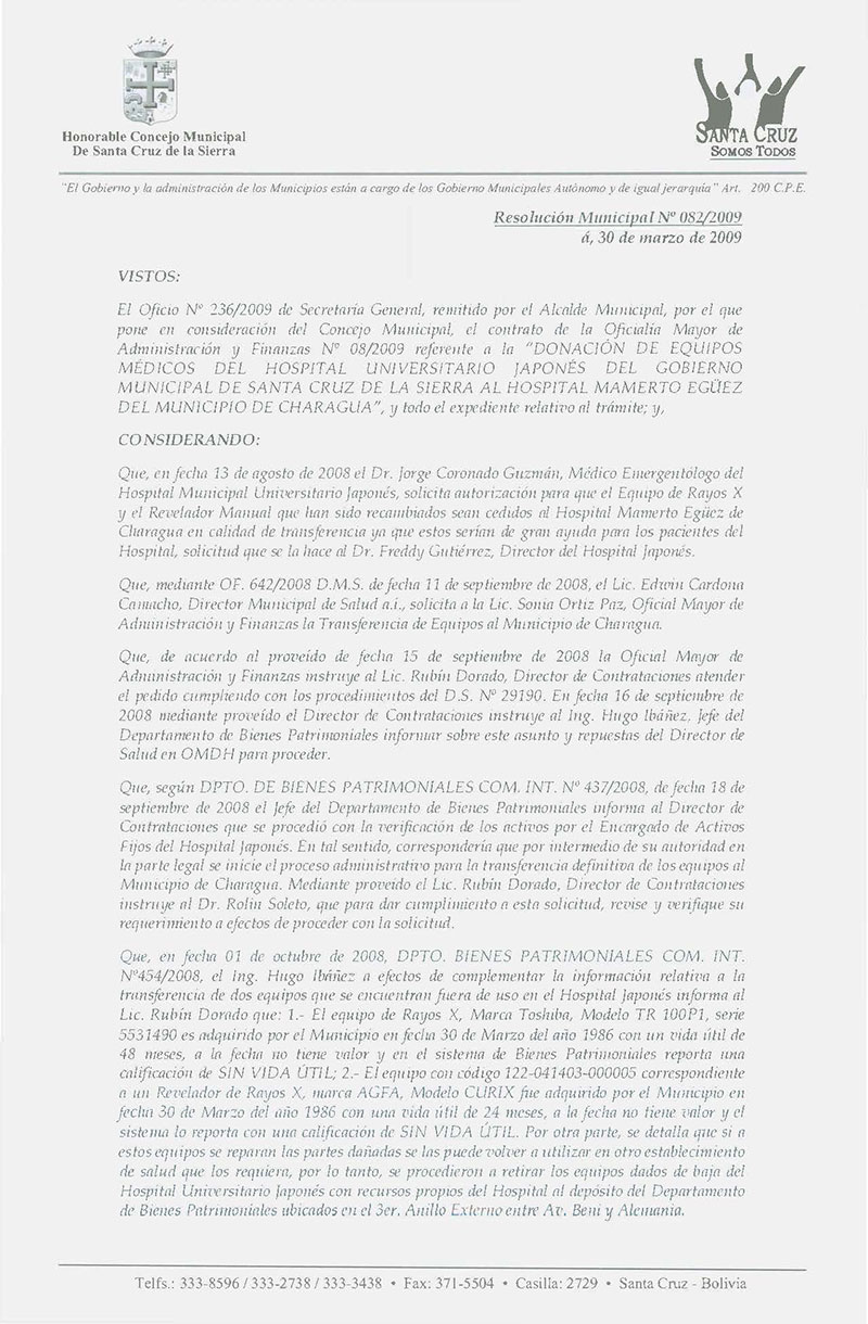Aprueba el Contrato de Oficialía Mayor de Administración y Finanzas N° 08/2009, referente a la "Donación de Equipos Médicos del Hospital Universitario Japonés del Gobierno Municipal de Santa Cruz de la Sierra al Hospital Mamerto Eguez del Municipio de Charagua.
