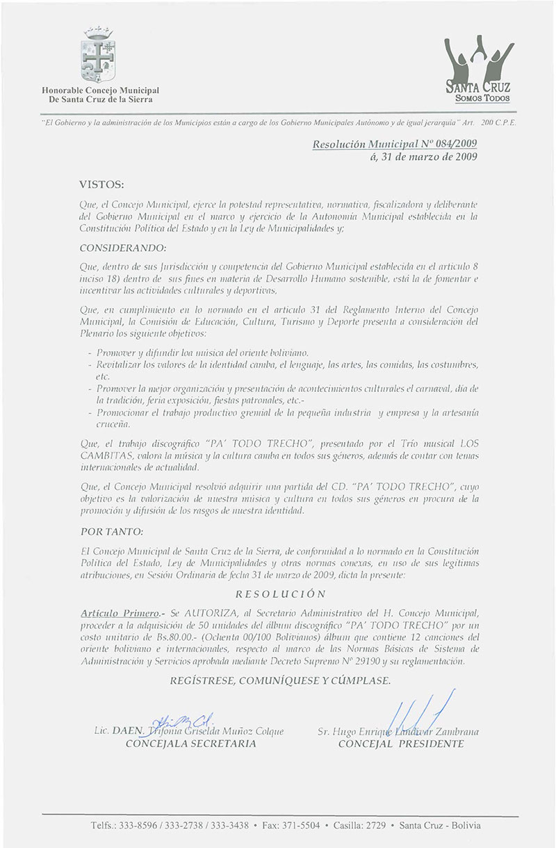 Autoriza, al Secretario Administrativo del H. Concejo Municipal, proceder a la adquisición de 50 unidades del álbum discográfico "PA´ TODO TRECHO" por un costo unitario de Bs.- 80,00, álbum que contiene 12 canciones del Oriente Boliviano e Internacionales, respecto al marco de las Normas Básicas de sistema de Administración y Sevicios, aprobada mediante Decreto Supremo N° 29190 y su reglamentación.