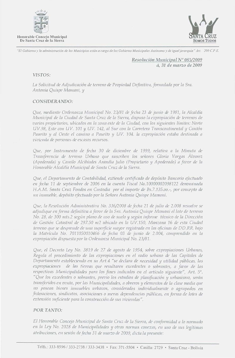 Aprueba la Minuta de Transferencia de Terreno en propiedad definitiva a favor de la señora Antonia Quispe Mamani, ubicado en el Plan 3000 en la UV. 150 Mza 16, signado con el N° 28, de la ciudad de Santa Cruz de la Sierra.
