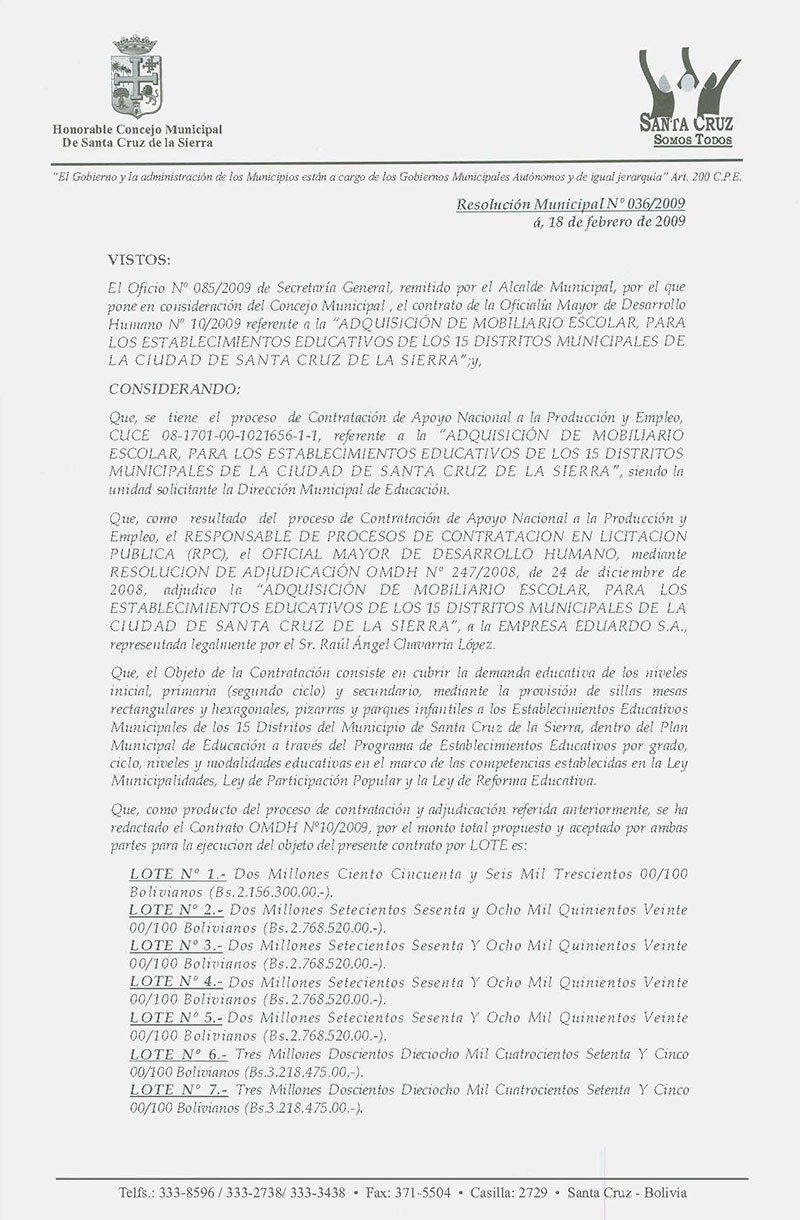 Aprueba el Contrato de la Oficialía Mayor de Desarrollo Humano N° 10/2009, por el monto de Bs. 19.667.330.- para la "Adquisición de Mobiliario Escolar para los establecimientos Educativos de los 15 Distritos Municipales de la Ciudad de Santa Cruz de la Sierra.