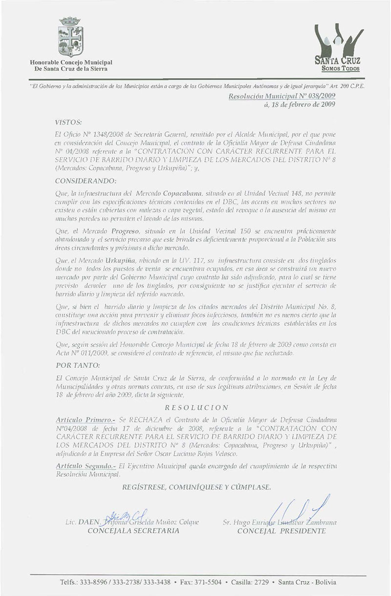 Rechaza el Contrato de la Oficialía Mayor de Defensa Ciudadana N° 04/2008, referente a la "Contratación con carácter recurrente para el Servicio de Barrido Diario y Limpieza de los Mercados del Distrito No 8. (Mercados: Copacabana, Progreso y Urkupiña)".