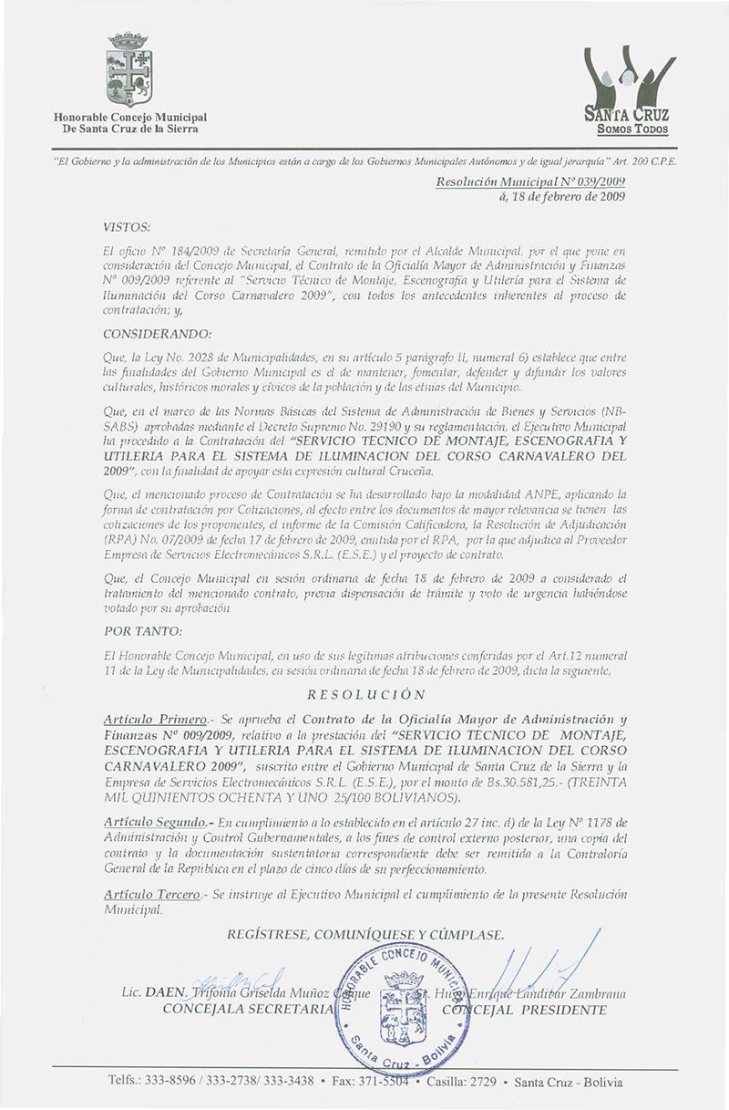 Aprueba el Contrato de la Oficialía Mayor de Administración y Finanzas N° 009/2009, relativo a la prestación del "Servicio Técnico de Montaje Escenográfico y Utilería para el sistema de iluminación del Corso Carnavalero 2009".