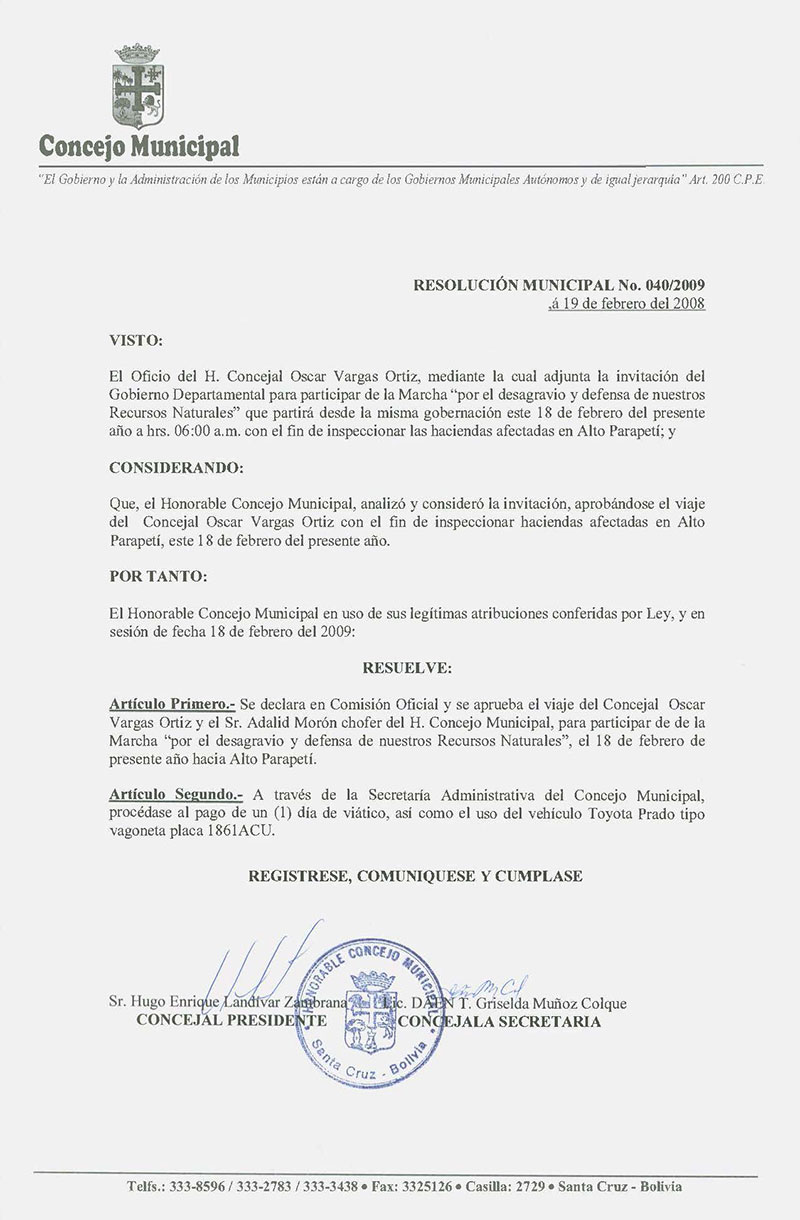 Declaratoria en Comisión del Concejal Sr. Oscar Vargas y el Sr. Adali Morón para participar de la Marcha "Por el Desagravio y Defensa de Nuestros Recursos Naturales" el 18 de febrero del presente año.