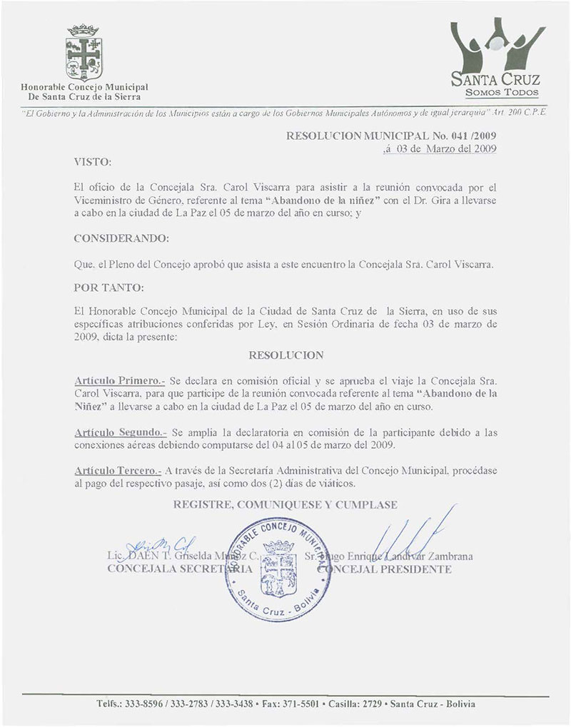 Declara en Comisión Oficial y se aprueba el viaje de la Concejala Sra. Carol Viscarra, para que participe de la reunión convocada referente al tema "Abandono de la Niñez" a llevarse a cabo en la Ciudad de La Paz el 05 de marzo del año en curso.