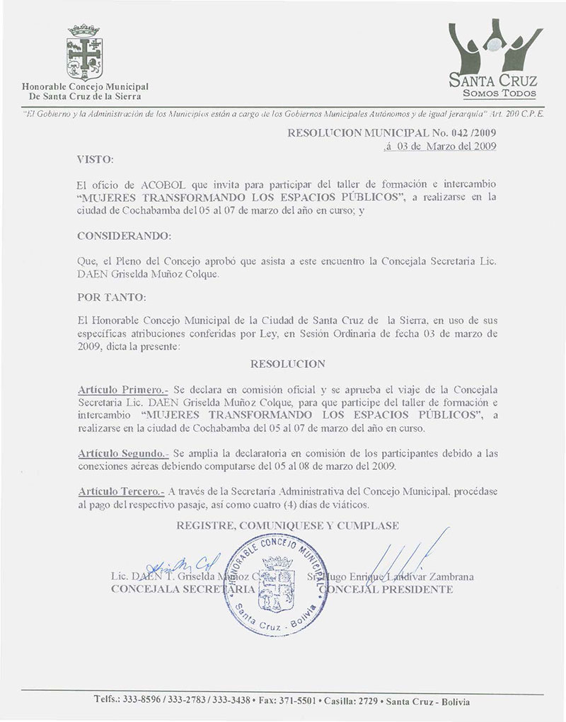 Declara en Comisión Oficial y se aprueba el viaje de la Concejala Lic. DAEN Griselda Muñoz Colque, para que participe del Taller de Formación e Intercambio "Mujeres Transformando los Espacios Públicos" a realizarse en la Ciudad de Cochabamba del 05 al 07 de marzo del presente año.