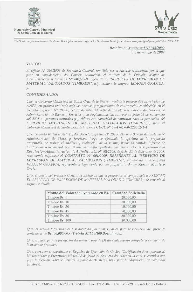 Aprueba el Contrato N° 001/2009, referente al "Servicio de Impresión de material valorados (Timbres); adjudicado a la empresa Imagen Gráfica por un monto de Bs. 30,000.00.