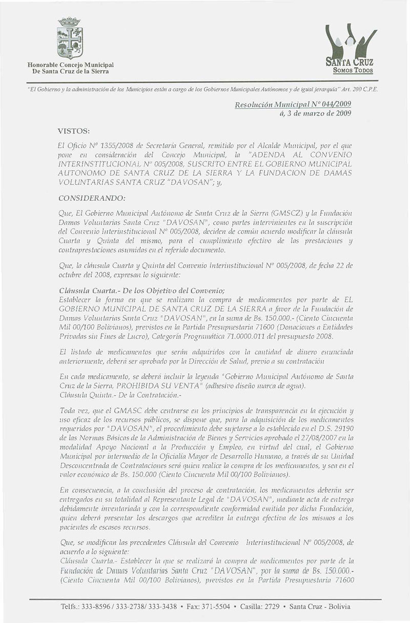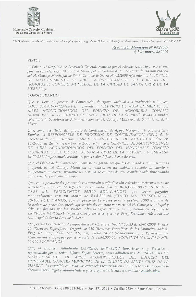 Aprueba el Contrato N° 02/2009, por el monto total de Bs. 63.600.- para el Servicio de Mantenimiento de Aires Acondicionados del Edificio del Concejo Municipal de la ciudad de Santa Cruz de la Sierra.
