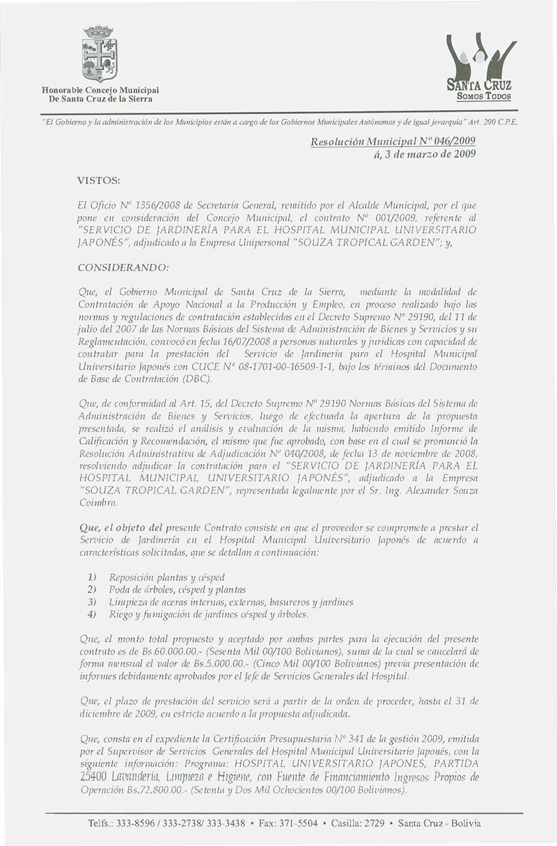Aprueba el Contrato N° 001/2009, referente al "Servicio de Jardinería para el Hospital Municipal Universitario Japonés", adjudicado a la Empresa Unipersonal "Souza Tropical Garden".