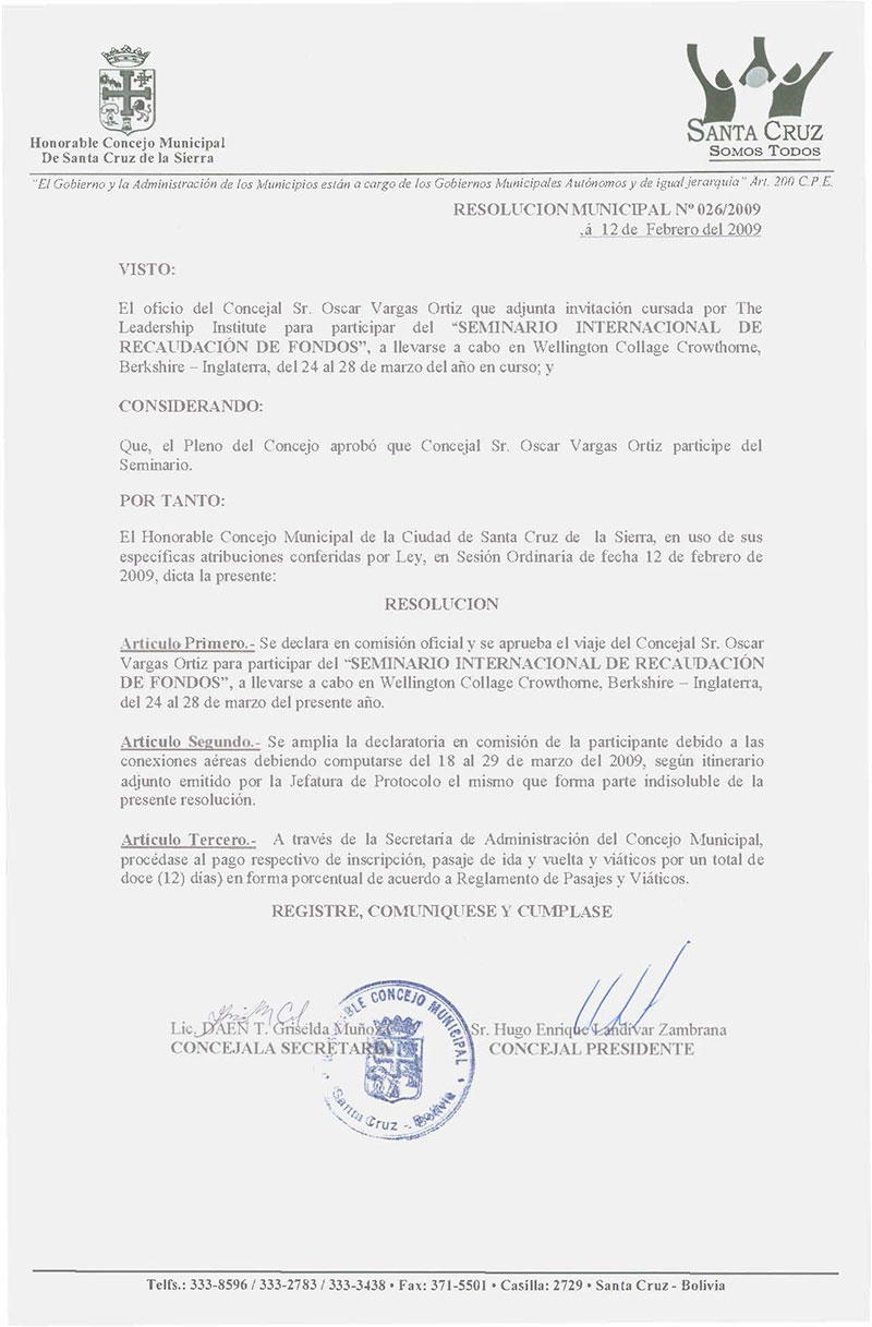 Declara en Comisión Oficial y se aprueba el viaje del Concejal Sr. Oscar Vargas Ortiz par participar del "Seminario Internacional de Recaudación de Fondos" a llevarse a cabo en Wellington Collage Crowthorne, Berkshire-Inglaterra, del 24 al 28 de marzo del presente año.