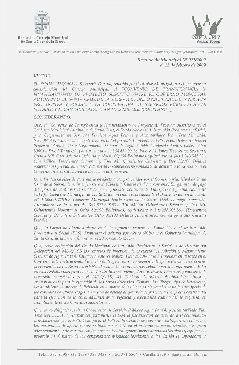 Aprueba el "Convenio de Transferencia y Financiamiento de proyecto suscrito entre el Gobierno Municipal Autónomo de Santa Cruz de la Sierra, El Fondo Nacional de Inversión Productiva y Social, y la Cooperativa de Servicios Públicos Agua Potable y Alcantarillado Plan Tres Mil Ltda. (COOPLAN).