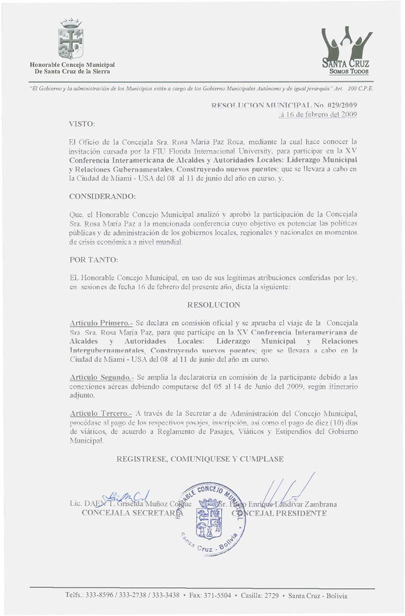 Declara en Comisión Oficial y se Aprueba el viaje de la Concejala Sra. Rosa María Paz, para participar en la XV Conferencia Interamericana de Alcaldes y Autoridades Locales: Liderazgo Municipal y Relaciones Intergubernamentales, construyendo nuevos puentes; que se llevará a Cabo en la Ciudad de Miami - USA del 08 al 11 de junio del año en curso.