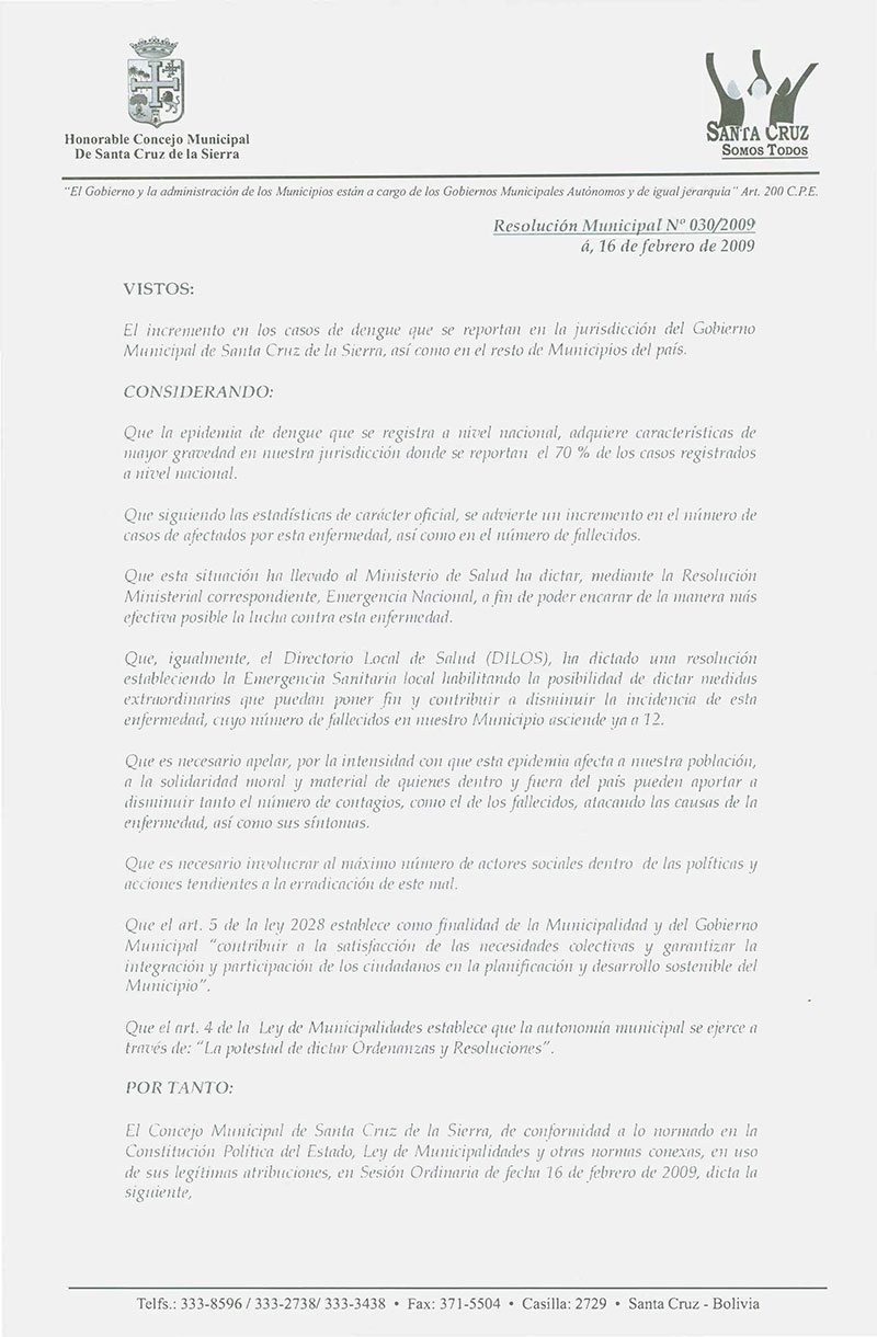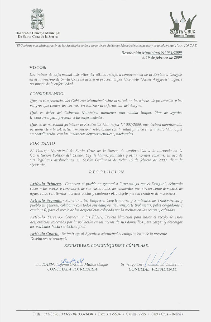 Convoca al pueblo en general a "Una Minga por el Dengue" debiendo sacar a las aceras o corredores de sus casas todos los elementos que sirvan como depósito de agua, como ser: llantas, botellas vacías y cualquier otro objeto que sea criadero de mosquito.