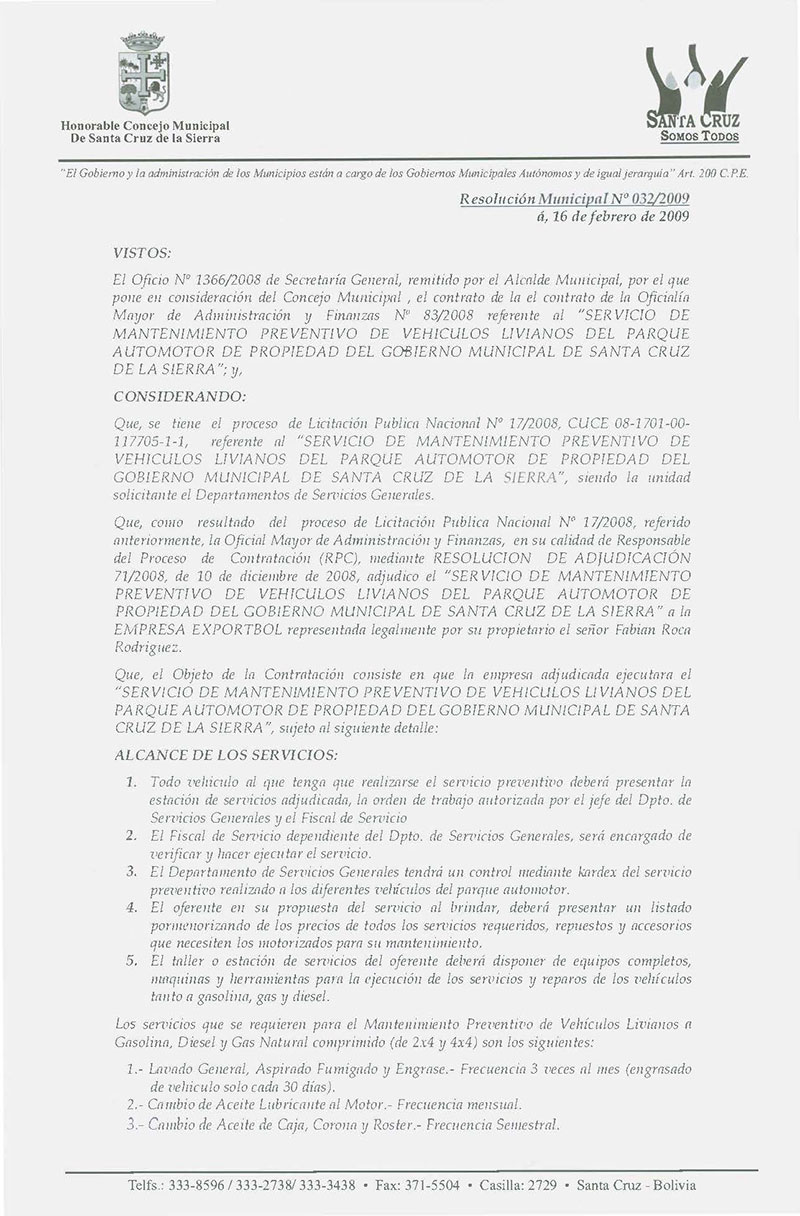 Aprueba el Contrato N° 83/2008, por el monto de Bs. 751,800,00.- para el Servicio de Mantenimiento preventivo de vehículos livianos del Parque Automotor de propiedad del Gobierno Municipal de Santa Cruz de la Sierra.