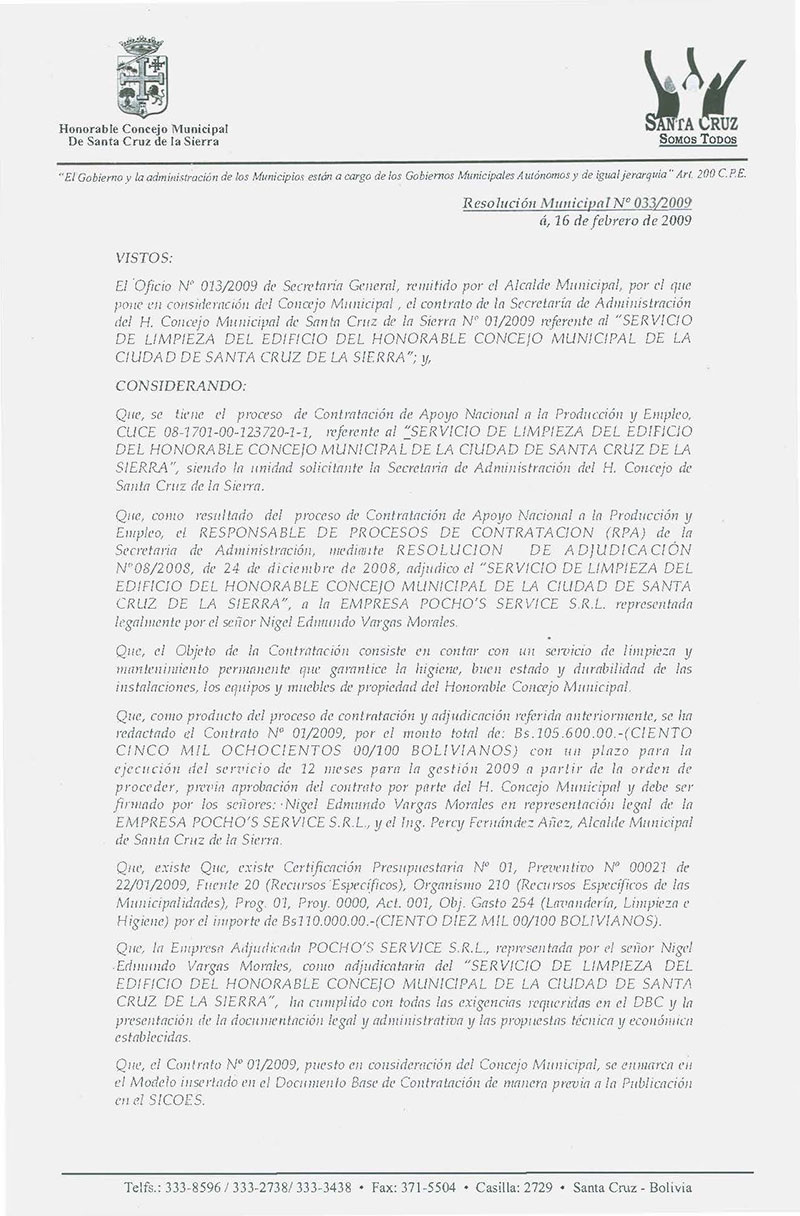 Aprobación del Contrato N°. 01/2009, Servicio de Limpieza del Edificio del Honorable Concejo Municipal de Santa Cruz de la Sierra, por el monto de Bs. 105.600, adjudicado a la Empresa POCHO´ S SERVICE S.R.L.