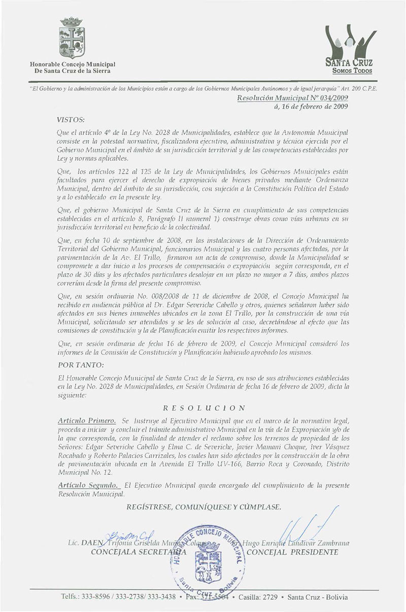 Instruye al Ejecutivo Municipal que en el marco de la normativa legal, proceda a iniciar y concluir el trámite administrativo municipal en la vía de la expropiación y/o de la que corresponda, con la finalidad de atender el reclamo sobre los terrenos de propiedad de los Sres. Edgar Severiche Cabello y Elma C. de Severiche, Javier Mamani Choque, Iver Vásquez Rocabado y Roberto Palacios Carrizales, los cuales han sido afectados por la construcción de la obra de pavimentación ubicada en la Avenida El trillo UV-166 Barrio Roca y Coronado.