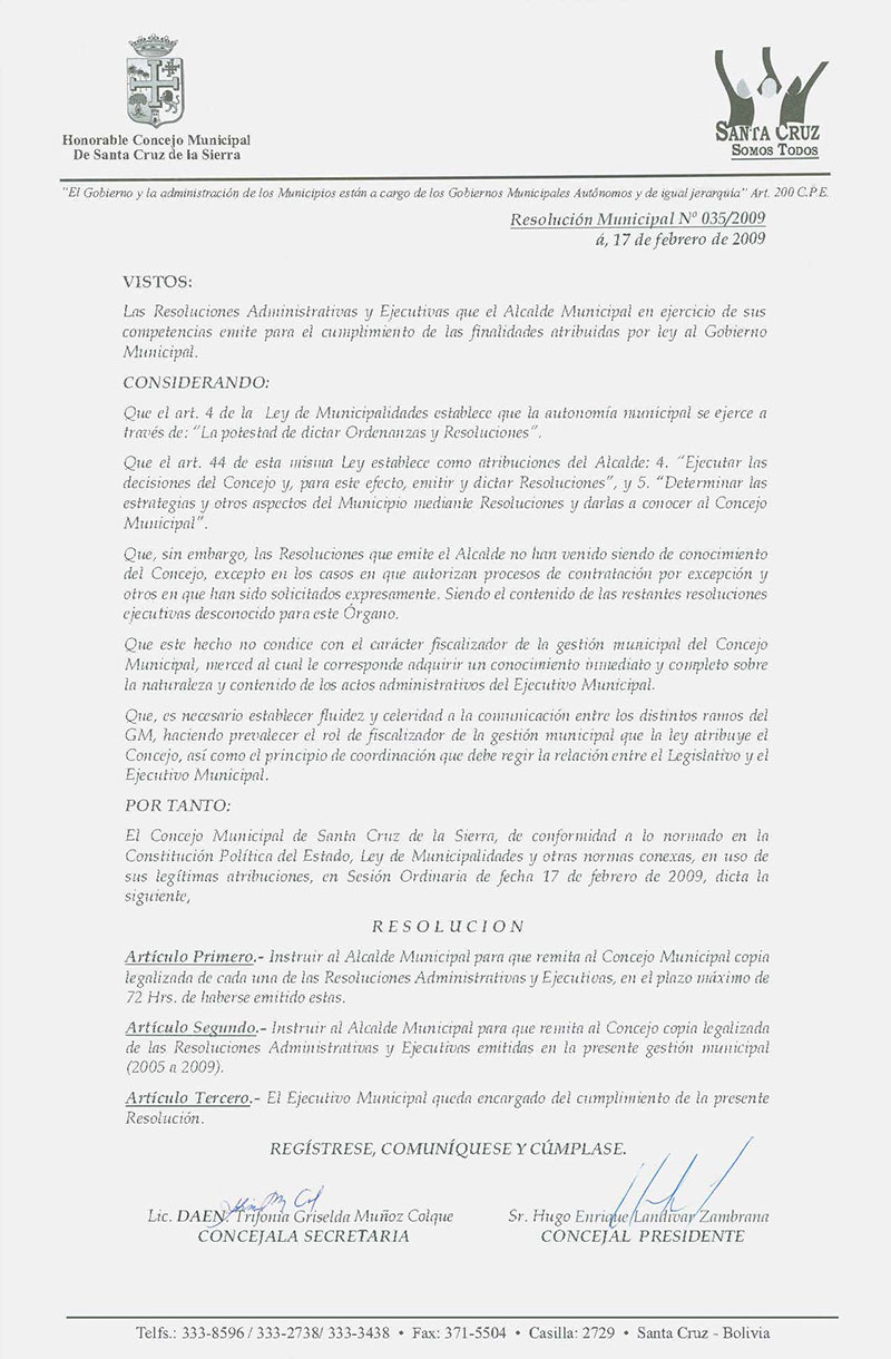 Instruye al Alcalde Municipal para que remita al H. Concejo Municipal copia legalizada de cada una de las Resoluciones Administrativas y Ejecutivas, en el plazo máximo de 72 horas de haberse emitido estas.
