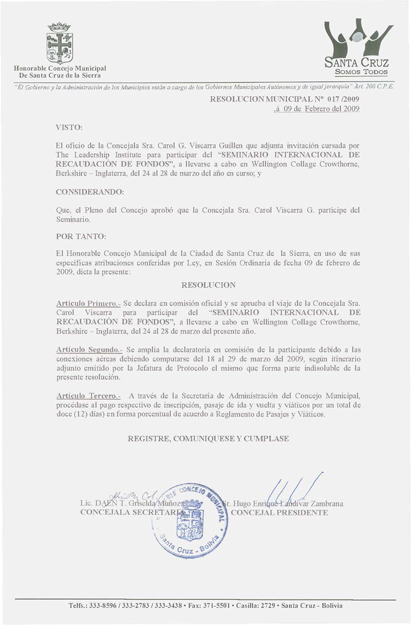 Declara en Comisión Oficial y se Aprueba el viaje de la Concejala Sra. Carol Viscarra para participar del "Seminario Internacional de Recaudaciones de Fondos", a llevarse a cabo en Wellington Collage Crowthorne, Berkshire - Inglaterra del 24 al 28 de marzo del presente año.