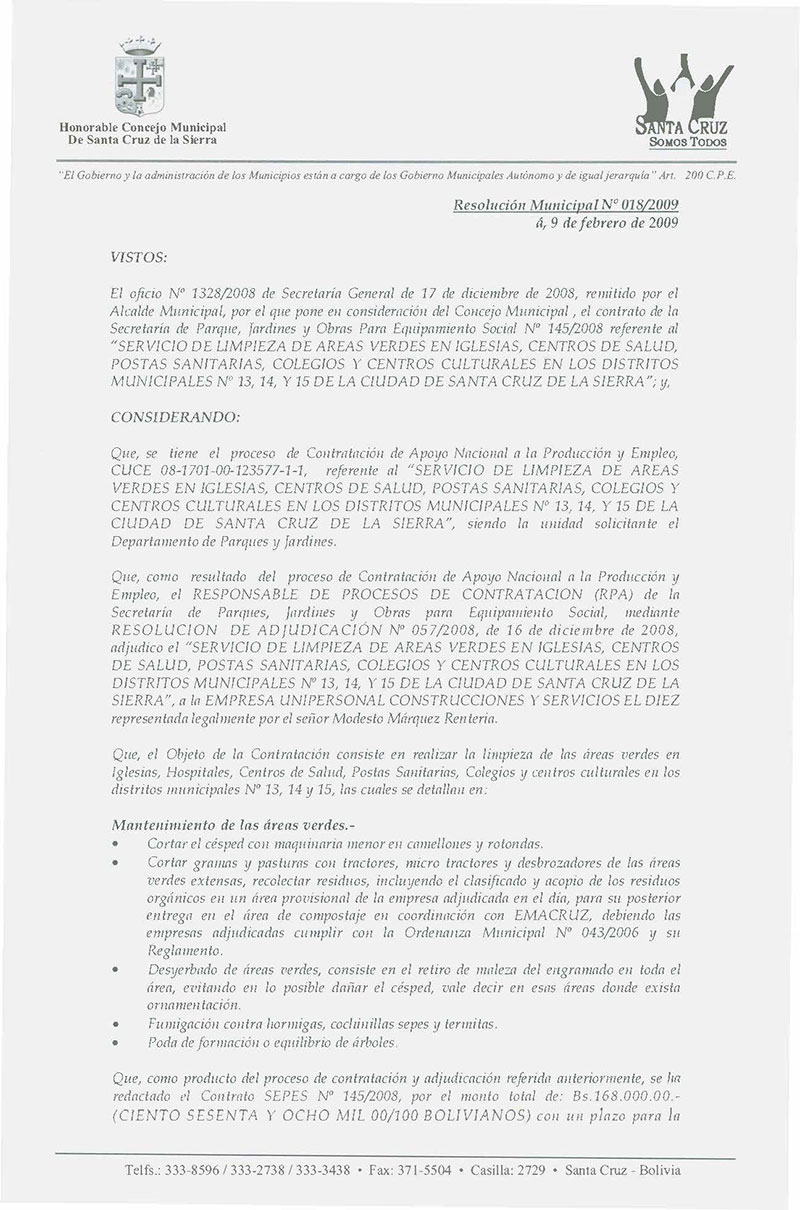 Aprueba el Contrato de la Secretaria de Parques, Jardines y Obras para Equipamiento Social N° 145/2008, por el monto total de Bs.- 168,000.00.- referente al "Servicio de Limpieza de Áreas Verdes en Iglesias, Centros de Salud, Postas Sanitarias, Colegios y Centros Culturales en los Distritos Municipales N° 13,14 y 15 de la ciudad de Santa Cruz de la Sierra.