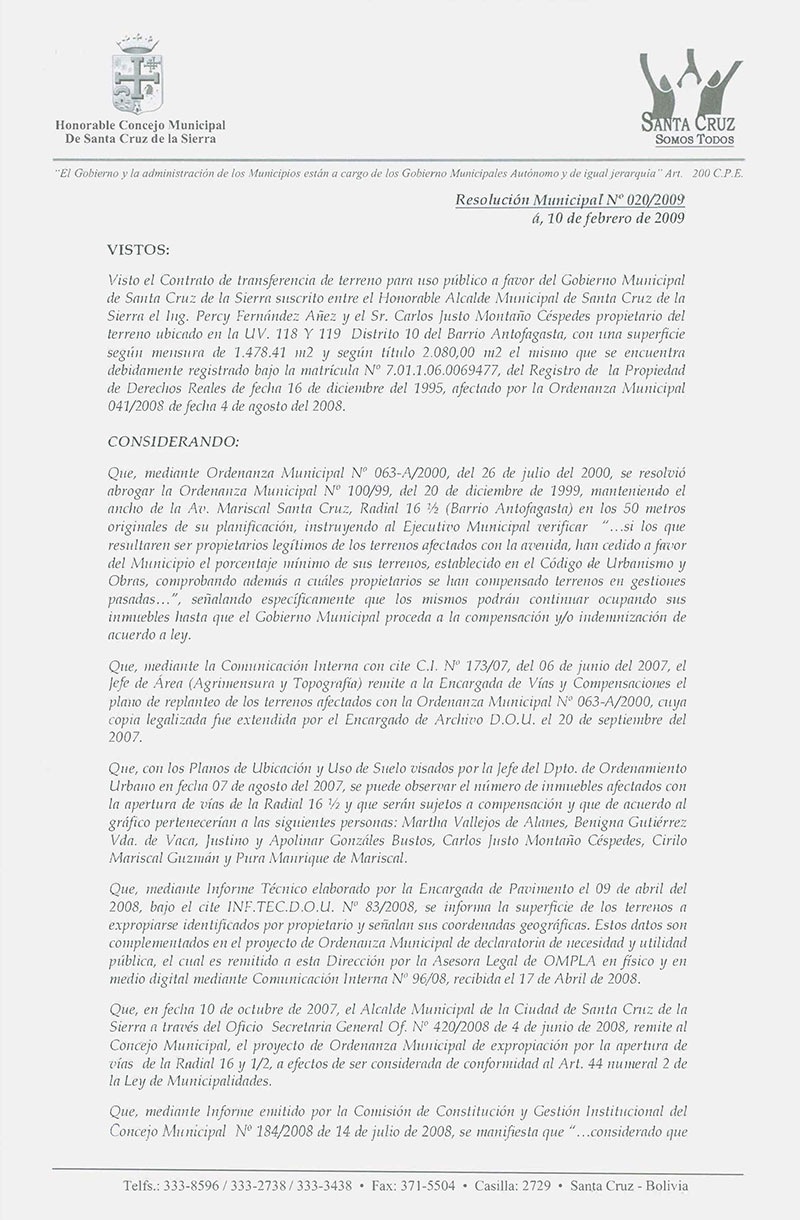 Aprueba el Contrato de Transferencia de Terreno para Uso Público a favor del Gobierno Municipal de Santa Cruz de la Sierra, que realiza el Sr. Carlos Justo Montaño Céspedes, propietario del Terreno ubicado en la UV. 118 y 119, Distrito N° 10 del Barrio Antofagasta.