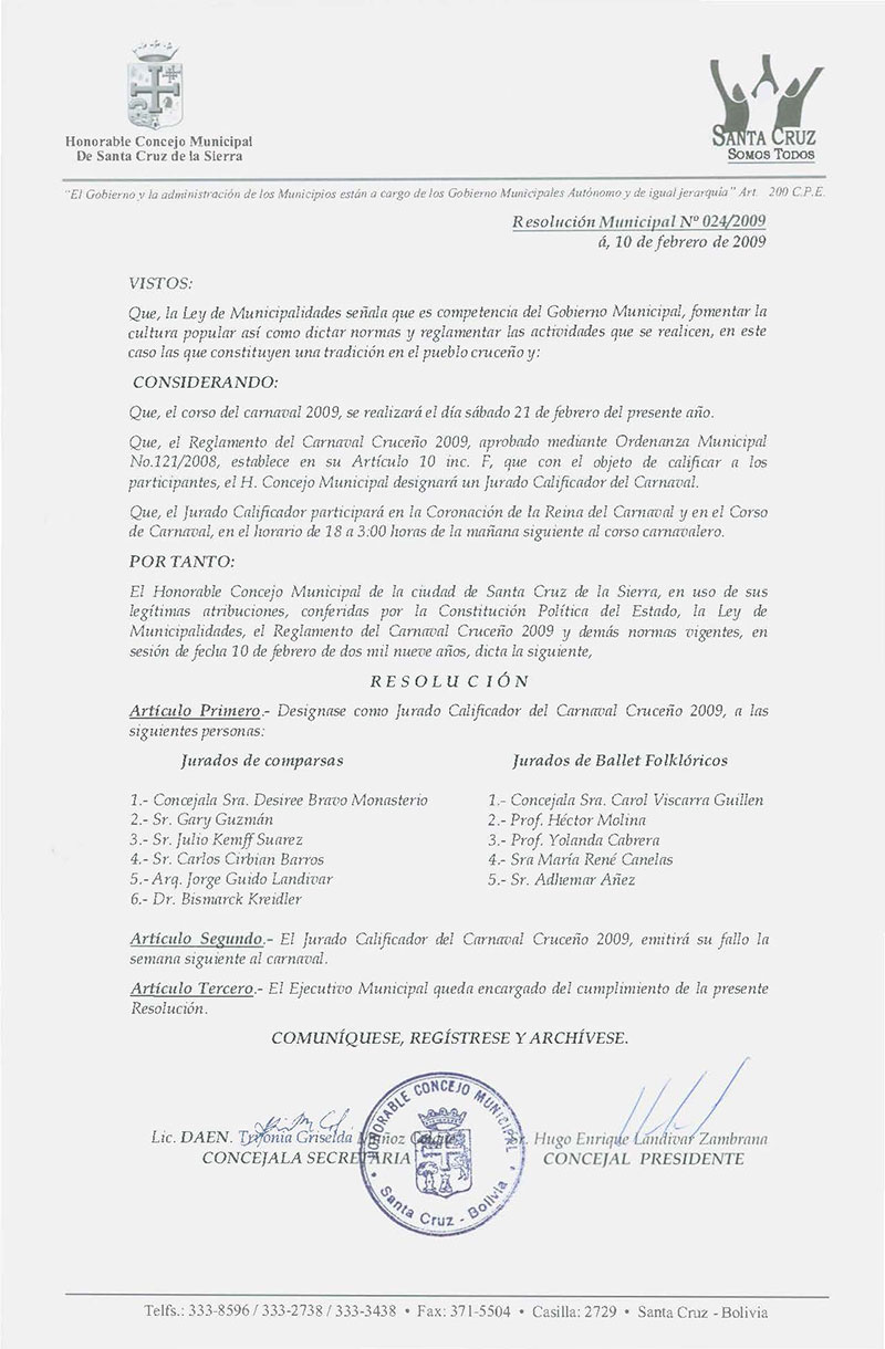Designación como Jurado Calificador del Carnaval Cruceño 2009 a diferentes Ciudadanos.