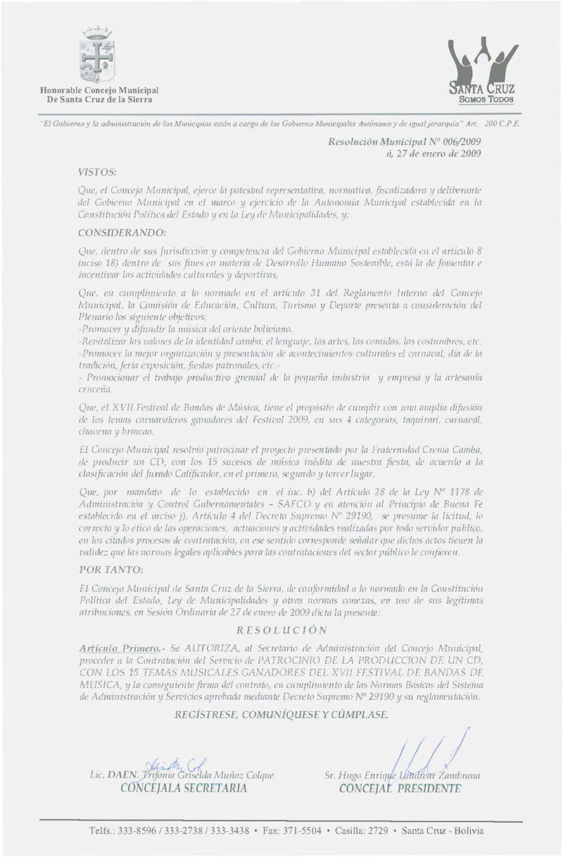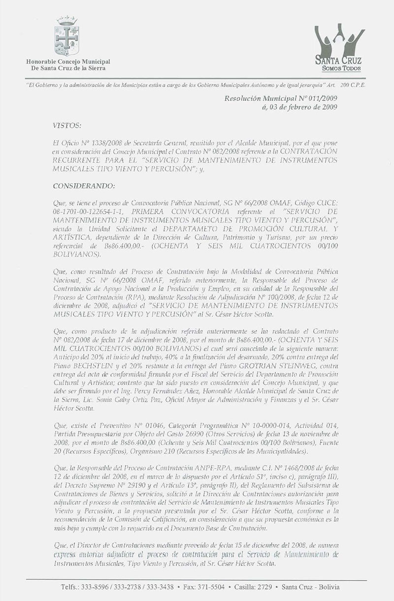 Aprueba el Contrato N° 082/2009, por el valor de Bs. 86,400,00.- referente al "Servicio de Mantenimiento de Instrumentos Musicales tipo viento y percusión", adjudicado al Sr. Cesar Héctor Scotta.