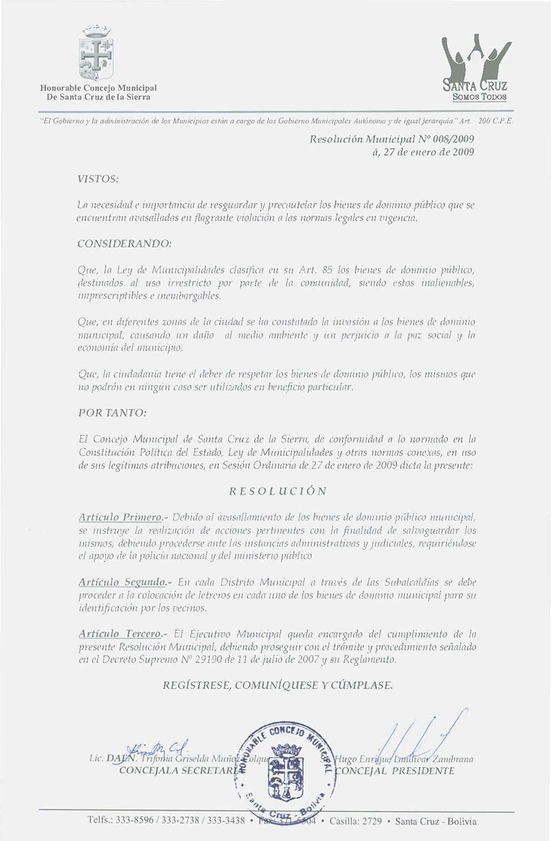 Instruye al Ejecutivo salvaguardar los Bienes de dominio público municipal ante los avasallamientos de terceros, asimismo dispone proceder ante instancias administrativas y judiciales, requiriéndose el apoyo de la Policía Nacional y del Ministerio Público. Así mismo establece que en cada Distrito Municipal a través de las Subalcaldías se debe colocar letrero en cada uno de los Bienes de dominio Municipal para su identificación por los vecinos.