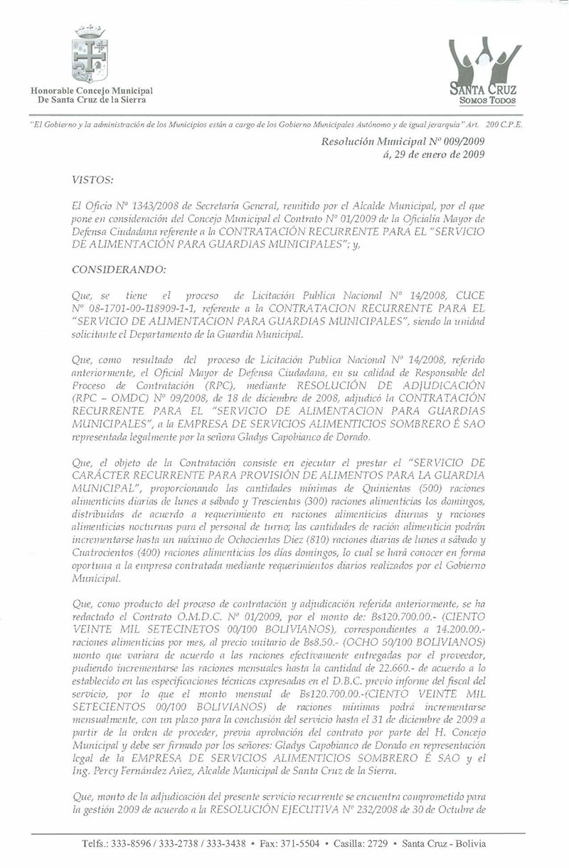 Aprueba el Contrato No. 001/2009, de la Oficialía Mayor de Defensa Ciudadana, referente al Servicio de Alimentación para los Guardias Municipales, adjudicado a la Empresa de Servicios Alimenticios Sobrero E Sao, por el monto de Bs. 120.000 (Ciento Veinte Mil 00/100 Bolivianos).